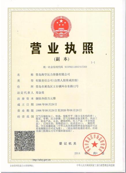 Our company specializes in pressure vessel products and possesses comprehensive and authoritative qualifications. We possess a valid business license, providing a solid foundation for our operations. We hold a Special Equipment Production License from the People's Republic of China, demonstrating our compliance and expertise in special equipment production. Furthermore, we have achieved ISO quality management system certification, providing strong assurance of product quality. Furthermore, we have obtained American Society of Mechanical Engineers (ASME) certification, further enhancing our recognition and competitiveness in the international market and high-end pressure vessel manufacturing, enabling us to fully meet all pressure vessel-related needs.